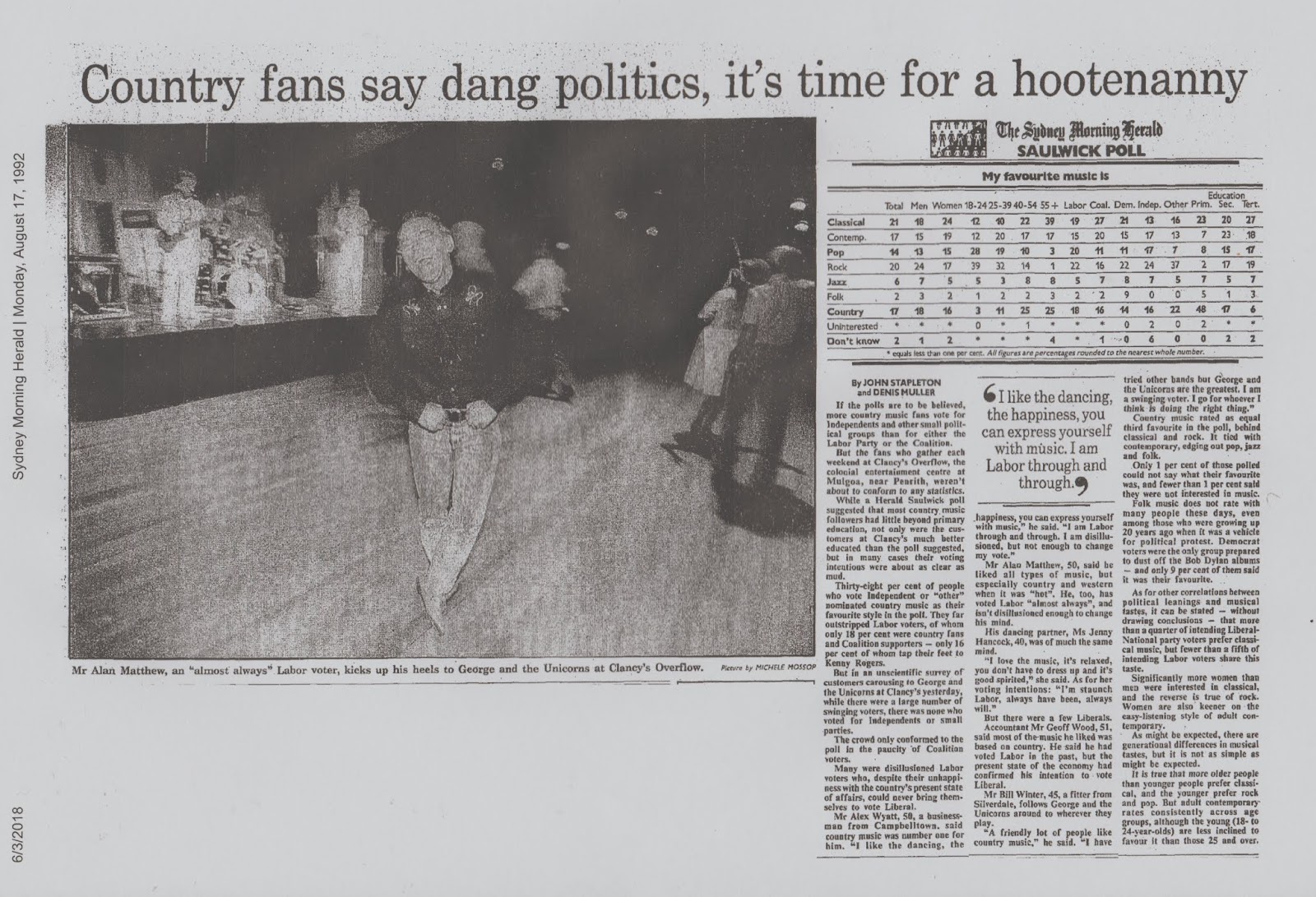Country fans say dang politics, it's time for a hootenanny, The Sydney Morning Herald, 17 August, 1992.